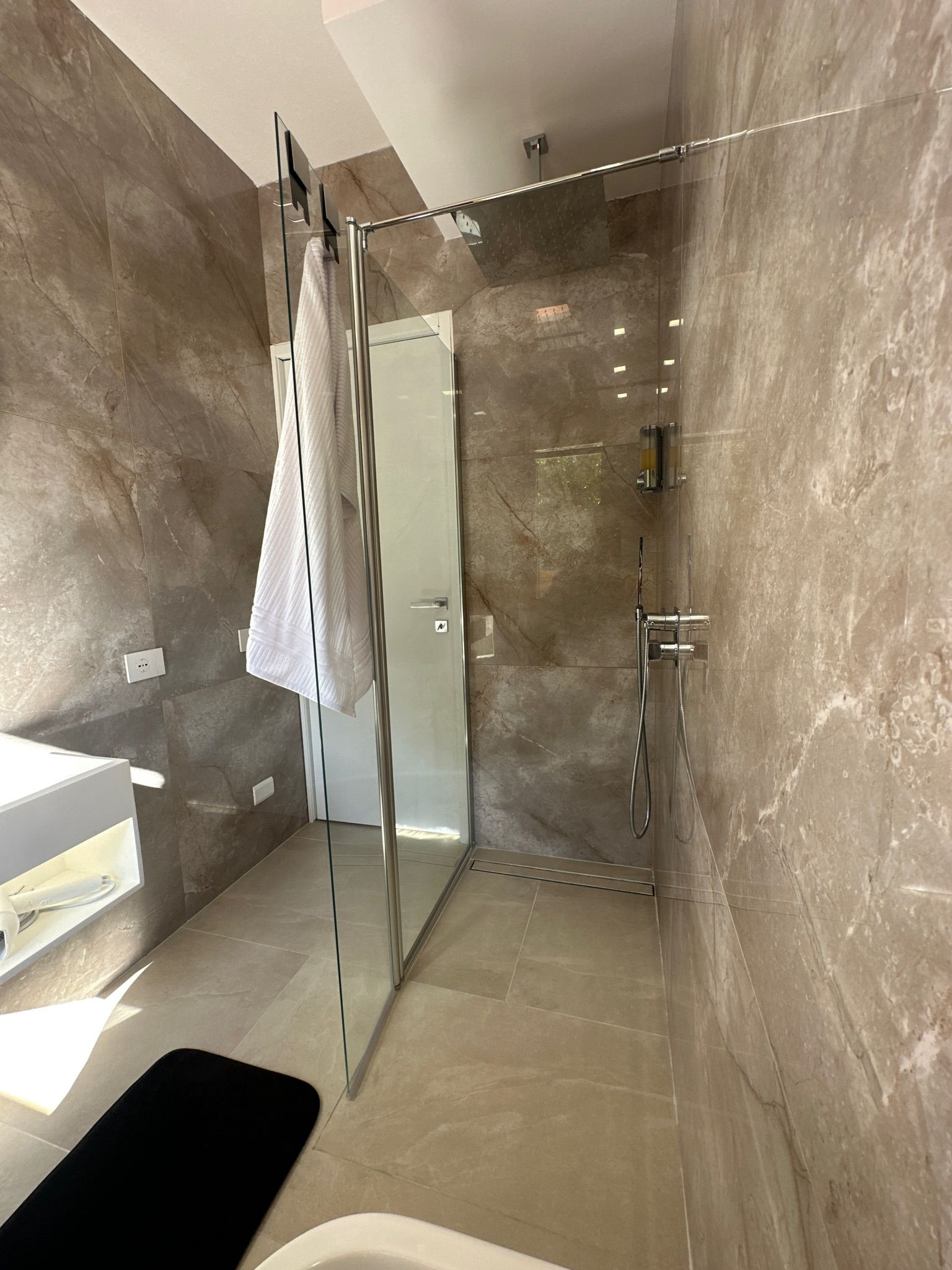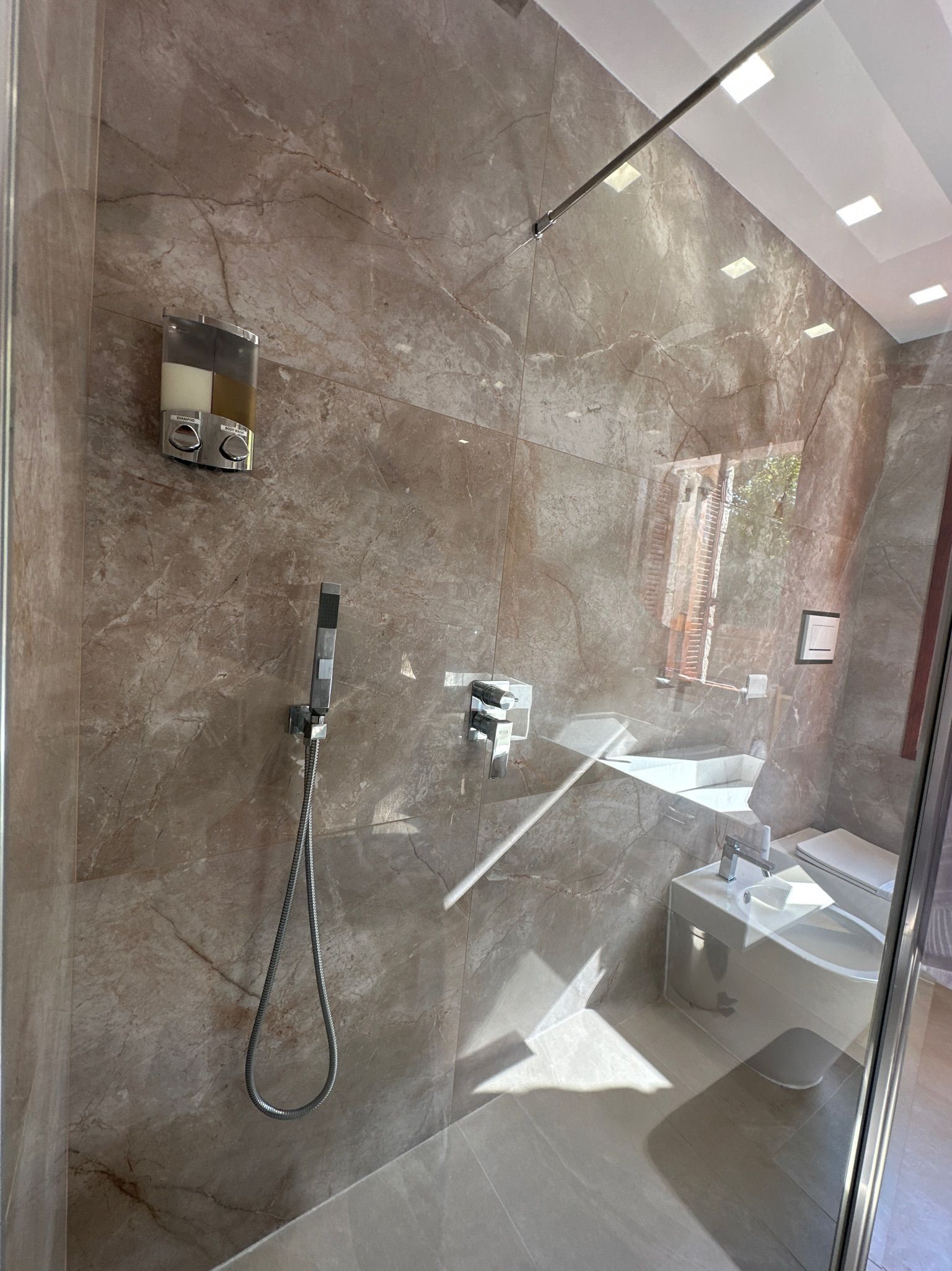 Il bagno è dotato di wc, bidet e doccia walk-in.